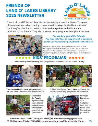 The Friends of Land O’ Lakes Library, Inc. is a volunteer organization that supports the library through fundraising, advocacy, and hands-on help.
